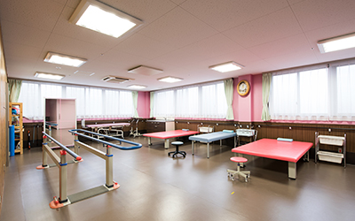 柔らかい色調のリハビリルームです。少しでも患者様に後遺症が残らず社会復帰していただけるよう、理学医療法士、作業療法士、言語聴覚士による早期の急性期リハビリを行なっています。