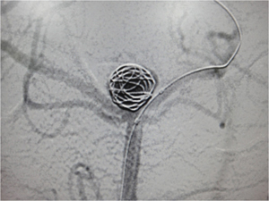 「切らない脳動脈瘤治療」です。頭をあけることなく局所麻酔(場合によっては全身麻酔もかけます)で動脈瘤の治療が出来るため、患者さんの体にやさしい治療といえます。形状によっては困難なことがあります。近年ではバルーン、ステント、カテーテル2本を駆使するダブルカテーテル法などがあり、治療困難瘤に対してもその対象を広げてきています。(※破裂動脈瘤ではステントの使用が原則認められていません)2002年にコイル塞栓術の方が開頭手術よりも治療成績が良いと海外から衝撃的報告がなされました(ISAT, Lancet)。現在、米国では全体の50%の患者さんに、欧州では70%の患者さんにこの治療がされています。本邦ではクリッピング術者の技量が高いことと、血管内治療の専門医へのアクセスに限りがあることから、普及していない地域もあります。それでも施設によっては第一選択になっているところもあります。当院ではコイルを常備しすぐに治療開始可能な状態としております。