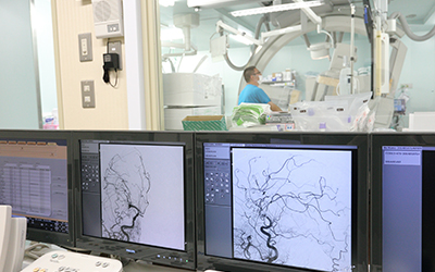 主に脳動脈瘤、脳動静脈奇形、血管狭窄症、脳梗塞の病気で行われる治療です。足の付け根又は手首よりカテーテルを挿入し、バルーン、ステントなどを用いて治療を行ないます。フィリップス社特注のバイプレーン・フラットパネル血管撮影装置を常時稼働し、体の中を3Dで立体的に見ながらカテーテルを誘導しています。患者様の身体の負担が少ないのが特徴で、当院のメインとなる手術です。